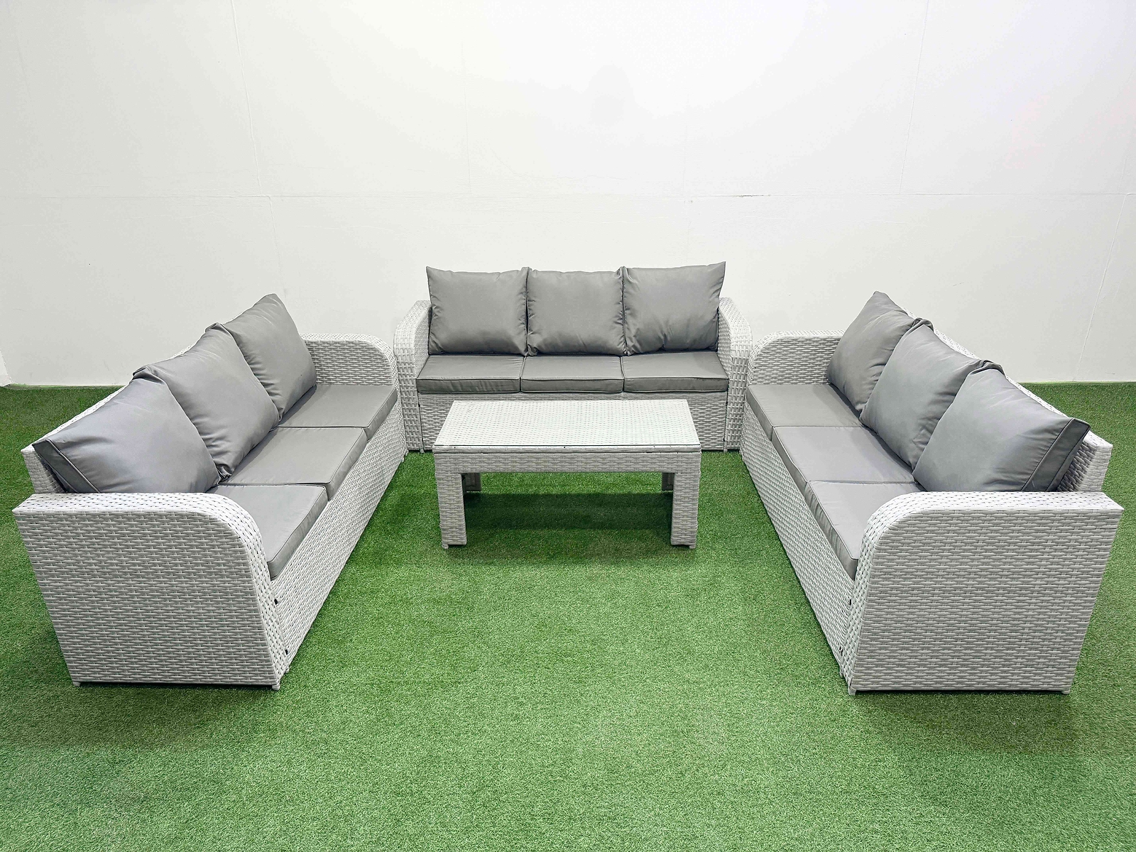 9 Seater=3 3 seater Sof a+1 Rectangular Coffee Table. 9 Seater+1 Side Table=3 3 seater Sof a+1 Rectangular Coffee Table+1 Side Table. 9 Seater+2 Side Tables=3 3 seater Sof a+1 Rectangular Coffee Table+2 Side Tables.