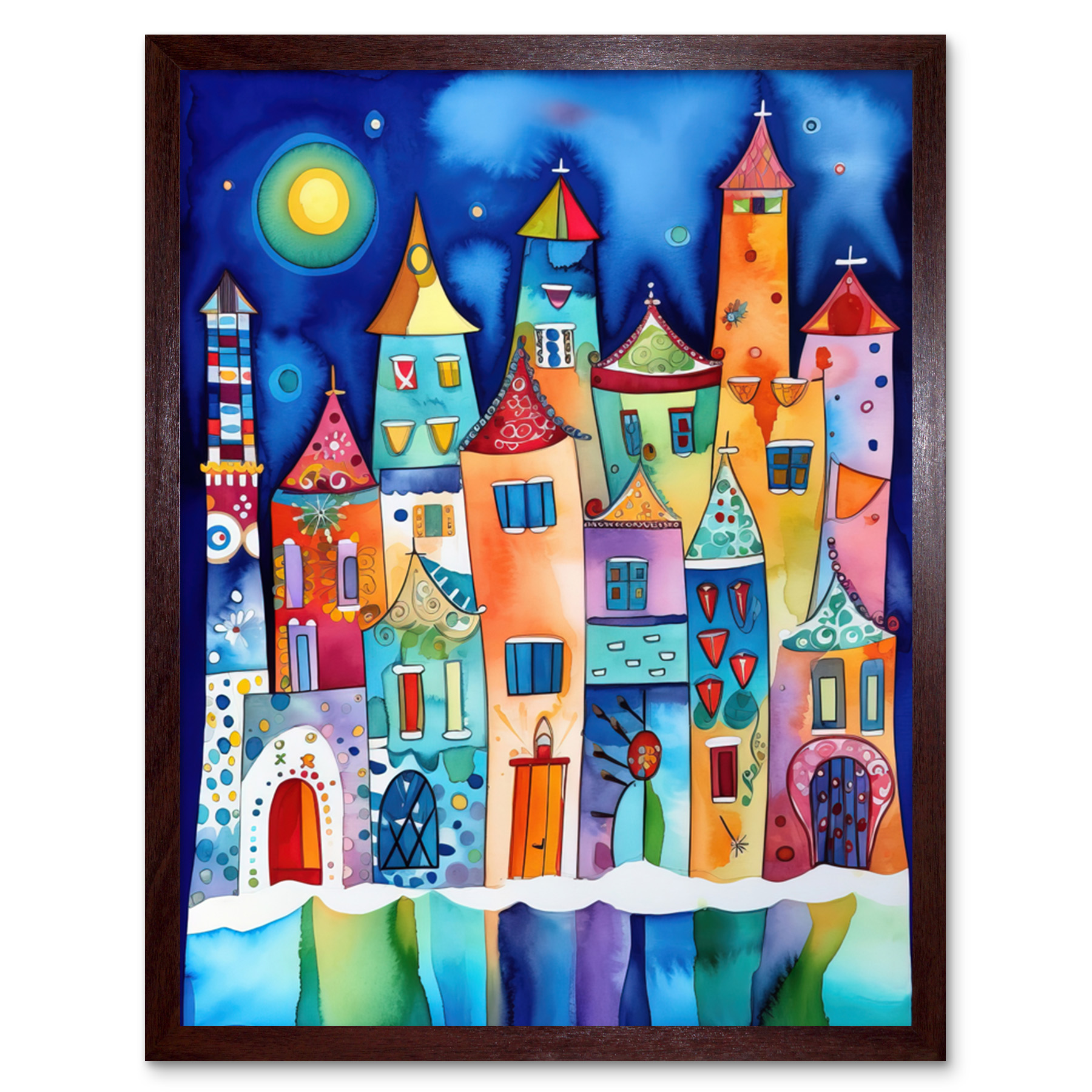 Midnight Abstract Town Modern Folk Art Framed Wall Art Picture Print A4