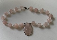 VINTAGE CHINESE CARVED PINK QUARTZ SHOUE BEAD & PENDANT CHOKER NECKLACE 15” LONG