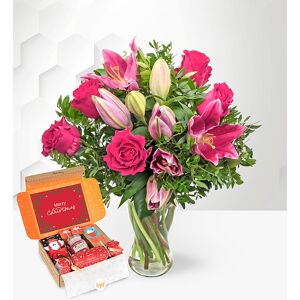 Embrace the festive spirit with our best-selling exquisite Christmas Rose and Lily bouquet, it’s the perfect floral arrangement for all holiday celebrations! Featuring beautiful pink Rhodos roses and oriental pink lilies complemented by fragrant palm, to create a breathtaking display. This bouquet is the perfect gift for sending warm wishes to friends and family or treating yourself this festive season. It makes a beautiful centrepiece and will add a touch of Christmas magic to any home. Handcrafted by our skilled florists with meticulous attention to detail, this exquisite bouquet truly captivates the charm of the Christmas season! Lilies may arrive in bud for extra freshness and to ensure longevity. This extraordinary bouquet is sure to bring joy and delight this holiday season. This bouquet comes with delicious luxury praline chocolates and a personalised Christmas card so you can send your heartfelt wishes this festive season!