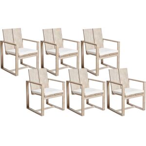 Wooden Outdoor Chairs with Cushions. Enrich your garden with this set of chairs with a classic look. Made from certified acacia wood, they are ideal for outdoor use. Their light brown colour and classic design allow them to match almost any decor in your garden. Thickly padded cushions attached to the set are upholstered in a durable, low-maintenance, UV- and water-resistant fabric in a toned taupe colour. Resistant to fading and light water exposure, they can be securely tied to the chair's backrest to prevent slipping, ensuring a comfortable seating experience. Details: Product Type: Garden Chair Style: Traditional General Color: Brown, Beige Shade: Light Brown Material Type: Wood Main Material: FSC® Certified Acacia Wood Additional Material: Fabric Legs material: Wood Seat Material: FSC® Certified Acacia Wood Material Composition: 100% Polyester Armrests: Yes Finish: Oiled Foldable: No Seat Foam Density: 18 kg/m3 Stackable: No Dimensions: Armrests Height: 63 cm Depth: 59 cm Seat