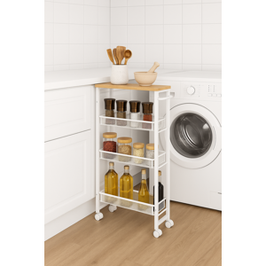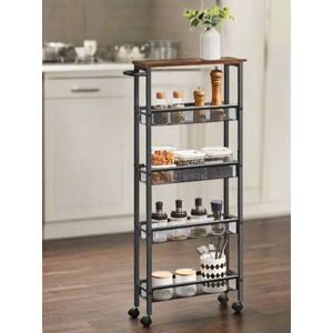 Maximize every inch of your home with this Slim 4-Tier Rolling Kitchen Trolley, perfect for narrow spaces in kitchens, bathrooms, laundry rooms, or living areas. Designed to fit tight gaps, this space-saving trolley measures just 45 x 15 x 80 cm, making it an ideal storage solution where room is limited. Space-Saving Design: Slim profile fits perfectly in narrow kitchen or bathroom gaps Four Storage Tiers: One sturdy worktop plus three shelves with side rails for secure storage Easy Mobility: Two lockable 360° swivel wheels and handle for smooth movement and stability Versatile Use: Ideal for kitchen supplies, spices, drinks, toiletries, or laundry essentials Colour: Rustic Brown, Black Material: Particleboard, Metal Dimensions: 45 x 15 x 80 cm (L x W x H) Product Weight: 5.3 kg Max Load per Shelf: 10 kg