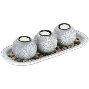 Create a cosy atmosphere in your home in no time with this decorative candle set. The elongated candle tray is ideal for long dining tables, but also looks great on a windowsill, side table or chest of drawers, where the warm, flickering candlelight creates an atmospheric ambience. The candle decoration impresses with its modern look and great leaf design. Tea light holder in detail - Overall dimensions H x D: approx. 13.5 x 19.5 cm - Small candleholder H x D: approx. 7 x 6 cm - Medium candleholder H x D: approx. 9 x 7 cm - Large candleholder H x D: approx. 12 x 7.5 cm - Total weight: approx. 0.75 kg - Material: MDF, stone - Colour: Black, brown Tea light stand set as a stylish home decoration - Practical set with 3 candleholders, tray and stones - Black candleholders with a great leaf design - Ideal as stylish table decorations in the living room and dining room - Also eye-catching on window sills or sideboards - For a cosy atmosphere in your home Included in delivery - 1x candle