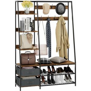 Are you looking for a versatile coat rack to well organize your stuff? Our multifunctional hall tree will be a perfect storage solution. It has 9 dual hooks, 6-tier shelves, 2 foldable dressers, 1 shoe bench and 2-tier shoe rack, allowing you to hang or place your hats, bags, clothes, shoes and more. Besides, you can sit on the bench to conveniently change shoes or use it as an ordinary storage shelf. If you need more space to display your ornaments, you can easily remove the fabric dressers. Also, our coat rack is made of solid steel and engineered wood materials, which is strong and durable enough to serve you and your family for a long time. Whats more, this hall tree features anti-toppling to keep it stable and safe to use. And the shelves with raised edges help to avoid items falling down. With smooth and waterproof surface, the coat rack is also easy to maintain. Costway Industrial Coat Rack Metal Garment Clothes Rails Storage Organizer 2 Drawers in Brown