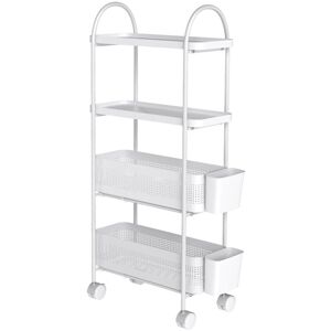 Description Keep your home and office organised with the Levede 4-Tier Trolley, a stylish and versatile rolling storage cart with a built-in drawer, 3 detachable hanging baskets, and 6 hooks. This utility trolley on wheels provides ample storage space for kitchen supplies, bathroom essentials, laundry items, beauty products, and office stationery. Perfect as a kitchen trolley, bathroom organiser, beauty trolley, laundry cart, or office storage unit, it is designed to keep everything neat and within easy reach. Built with a durable plastic and steel frame, this multi-purpose rolling organiser is strong, lightweight, and easy to move around. Measuring 104.4cm x 37cm x 33cm, the storage trolley is compact enough for small spaces yet spacious enough to hold everyday essentials. Its lockable wheels ensure stability, while the sleek white design makes it suitable for modern homes. Easy to assemble, this trolley cart with drawer and baskets is the perfect blend of practicality and style. Key