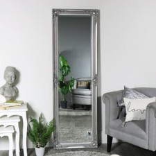 This Tall Silver Ornate Mirror with it's bevelled glass and ornate carvings is the perfect leaner mirror to add to your bedroom, living room or hall way! It can easily be wall mounted both portrait and landscape. A stunning and imposing silver effect ornate framed mirror. This silver ornate framed mirror is made from wood and resin , has an aged finish and bevelled mirrorwith bevelled glass and an ornate frame this 142cm high mirror is certain to make a difference to your roomThis mirror is part of a collection of large mirrors available for sale in a wide variety of colours, styles and shapes. Would you like to see more mirrors? View our full Mirror collection for more home decor ideas. Melody Maison Tall Silver Wall / Leaner Mirror 47cm X 142cm in Metallic Silver Size: 47 cm X 142 cm