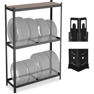 The tyre rack helps you keep your garage or workshop tidy. The wheel rack for 8 tyres is ideal for neat and space-saving storage of winter and summer tyres or the tyres of multiple cars. The distance between the shelves is adjustable to meet your needs. Thanks to the plug-in system, the tyre rack can be assembled quickly and easily. The sturdy steel construction ensures durability, while the plastic feet protect the floor from unsightly scratches. Tip: You will need a rubber mallet to assemble the plug-in connections. For your safety, wear gloves during assembly. Tyre rack in detail - Size H x W x D: approx. 180 x 120 x 40 cm - Shelf size W x D: approx. 119 x 39 cm - Total load capacity: max. 795 kg - Load capacity per level: max. 265 kg - Thickness per MDF board: approx. 6.5 mm - Weight: approx. 11.2 kg - Material: steel, MDF, plastic - Available in various colours Garage rack for tyre storage - Steel rack for neat storage of up to 8 tyres - The 3 levels can be adjusted to your