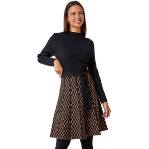 Contrast Skirt Knit Jacquard Dress from Roman. Perfect for the cooler season ahead, this contrast knit dress is crafted from a soft ribbed fabric. It features a cosy high neckline and long sleeves for a trendy finish. This dress is designed with a panelled, printed skirt which falls to an everyday knee-length in a flattering fit and flare style. Finished with a self-tie fabric belt, this is perfect paired with tights, boots and a fluffy gilet for an everyday Autumn look!