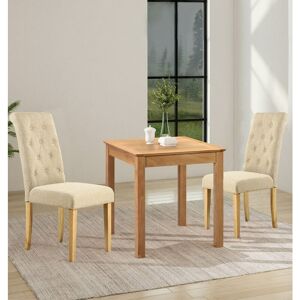 This small oak table with 2 fabric chairs is ideal if you are limited with space. Made from solid oak and oak veneer, this small square table could be used as a breakfast table in the kitchen or a dining table in the conservatory. The chairs could be tucked in under the table nicely when they are not in use The table is comprised of light oak and will fit perfectly into any room with a light, pastel or neutral colour scheme, as well as matching perfectly with our Light Oak Dining Chair to create a complete dining set. The lacquered finish offers protection and a surface which is easy to clean The Buttoned Cream Fabric Dining Chair is a particularly stylish and versatile piece that is the perfect combination of classic tradition and modern styling. The seat of this dining chair is worthy of specific mention. It is steel-sprung and features the additional benefit of nylon strapping. As it also comes with a high density luxury foam filling, the chair is extremely comfortable and the