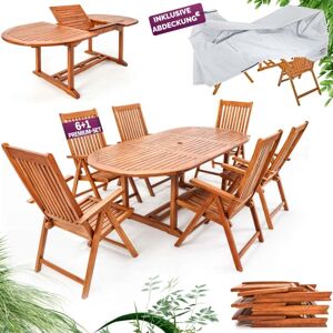 Take a seat and enjoy the summer! The 7-piece seating group from CASARIA® transforms your outdoor area into an inviting place full of natural charm. The folding high-back chairs offer first-class comfort with 5-way adjustable backrests and ergonomic armrests , while the practical table with butterfly extension creates additional space for spontaneous guests. A parasol can be placed in a holder in the centre of the table. The weatherproof, FSC®-certified eucalyptus wood is particularly robust and durable: the table can bear loads of up to 80 kg and the chairs up to 160 kg each . With regular care using special garden furniture oil, the wood will remain radiantly beautiful for many unforgettable summers! Product features: Elegant design 6 chairs with folding function Table with fold-out butterfly extension Space for 6-8 people Holder for parasol Ergonomic, 5-position adjustable backrest Easy to stow away Weatherproof and robust Beautiful wood colour Easy to assemble Technical