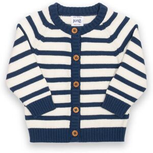 100% organic cotton Proud to be certified to the Global Organic Textile Standard (GOTS) Navy blue and cream knitted stripe 7-gauge midweight plain knit and transfer stitch Coconut button fastening Long sleeved Ribbed neck, cuffs and hem Round neck Made in India Machine washable at 40 degrees, or at 30 degrees to be kinder to the planet