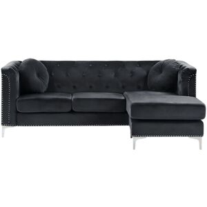 Modular Three Seater Couch. With this modular corner sofa, that allows placing the chaise either on the left or right side of the piece, you can rearrange your living room within minutes. With its velvet upholstery and tufted back, it adds a glam touch to any modern living area. The sofa is equipped with two round additional pillows and decorated with shiny nailhead trims that, together with the silver, metal legs, add a luxurious vibe to any modern set-up. The additional cushions feature a removable cover that translates to easy cleaning without a worry for stains. Details: Product Type: Corner Sofa Style: Modern General Color: Black, Silver Material Type: Fabric Main Material: Velvet Additional Material: Pine Wood Filling Material: Foam Material Composition: 100% Polyester Shape: L-Shaped Arm Style: Track Orientation: Left Hand Pattern: Solid Seat Construction: Sinuous Springs Seat Foam Density: 28 kg/m3 Seats Up To: 3 People Dimensions: Armrests Height: 77 cm Depth: 145 cm Seat